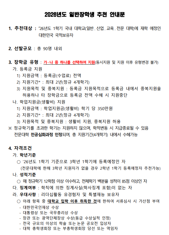 ○ 학생 신청안내 - 신청기간: 2025.11.3(월) ~ 11.4(화) 18:00 - 서류제출: 의정부캠퍼스 행함관 1층 학생팀 방문제출 - 추천인원: 1명(신청자가 다수일 경우 전체학기 백분위 성적 높은자 추천) - 문 의: 학생팀 031)870-3354 / 한국지도자육성장학재단 02)595-6815 |