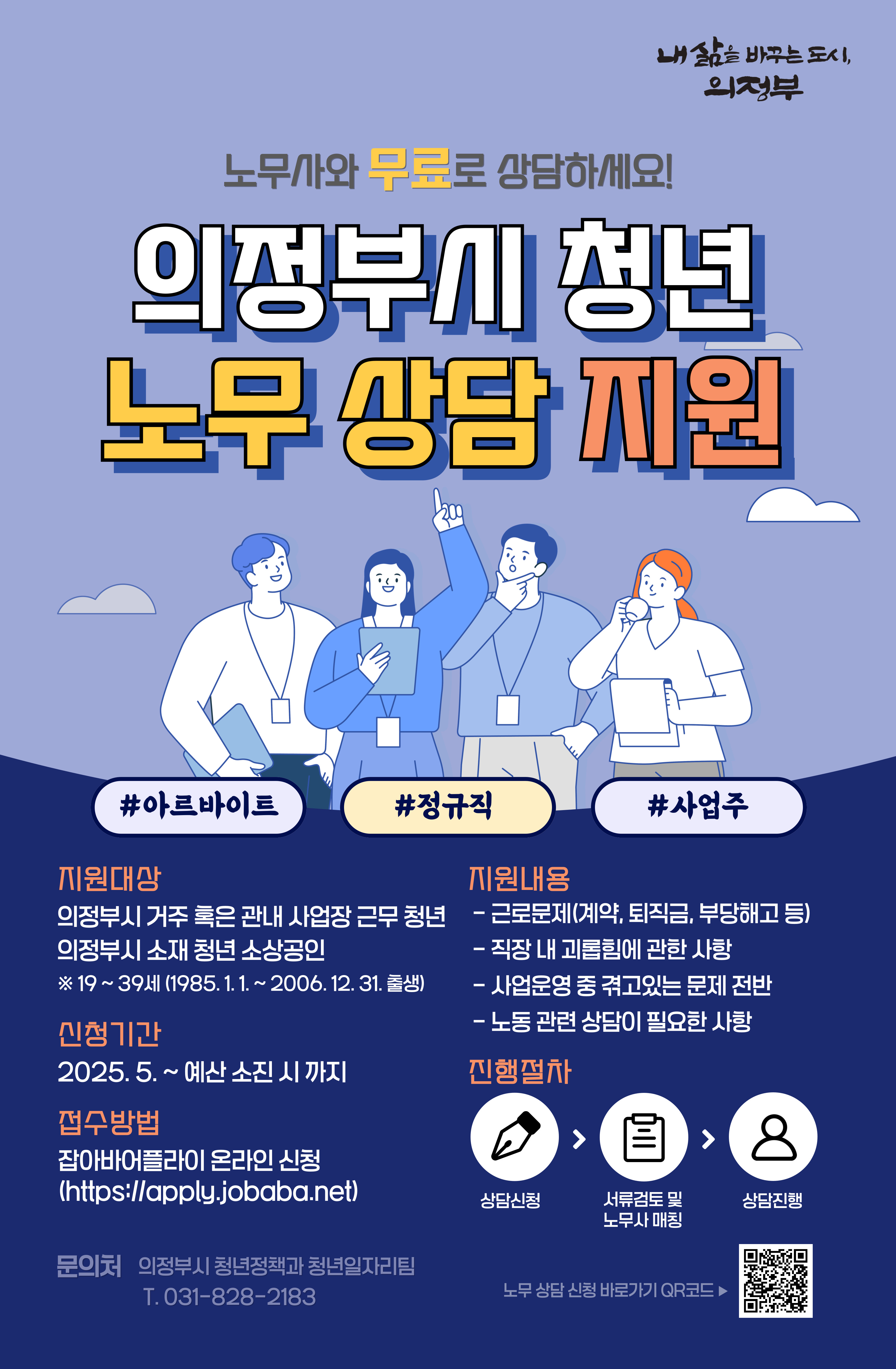 • 의정부시 청년 노무 상담 지원(상시) - 기간: 2025. 5. ~ 예산 소진 시까지 - 접수방법: 잡아바어플라이 통합접수시스템 (https://apply.jobaba.net) - 상담절차: 상담 신청 접수 → 관내 공인노무사 배정 → 상담 진행