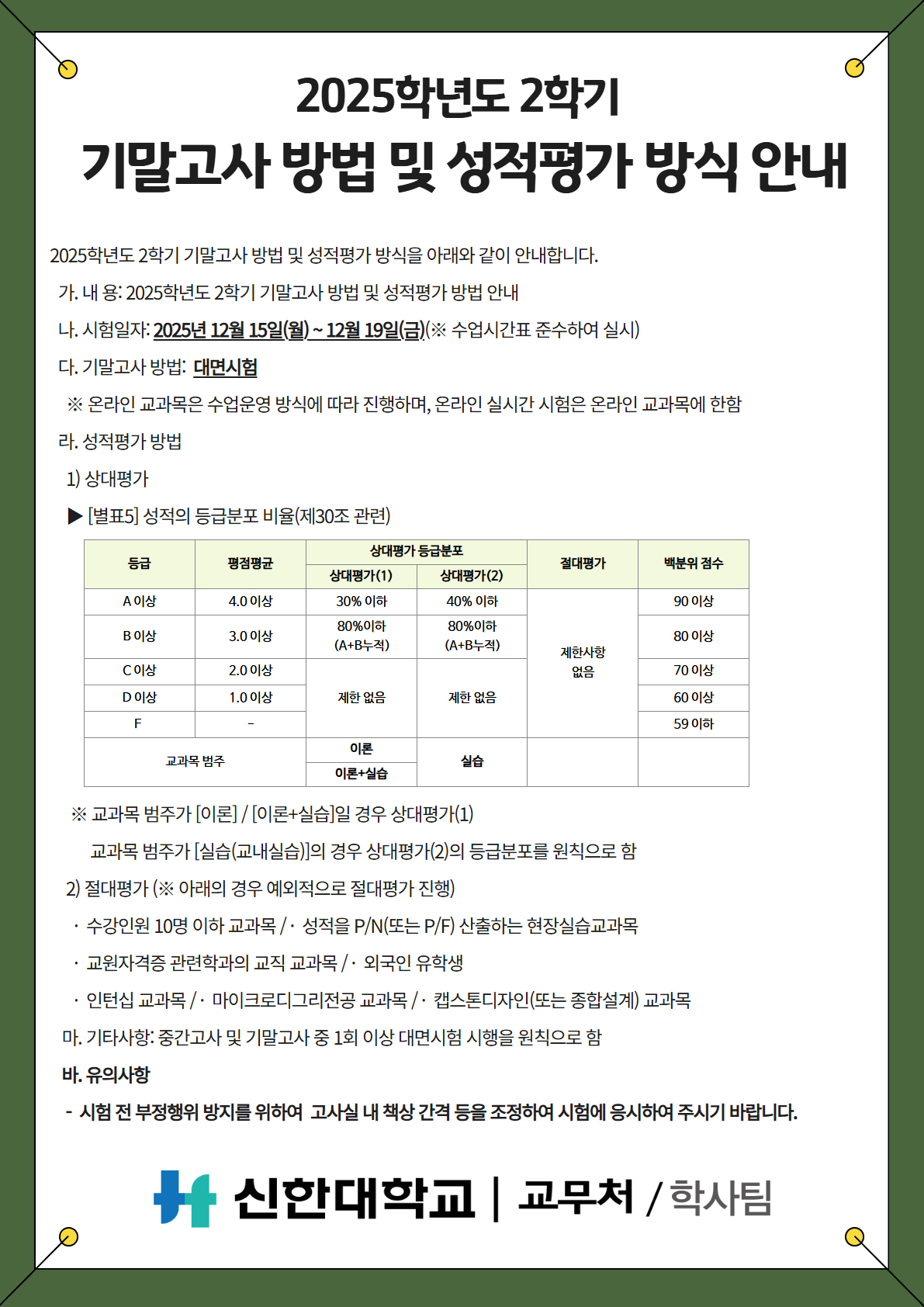 [학사팀/성적] 2025학년도 2학기 기말고사 방법 및 성적평가 방식 안내