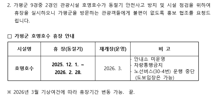 가평군 호명호수 휴장 안내