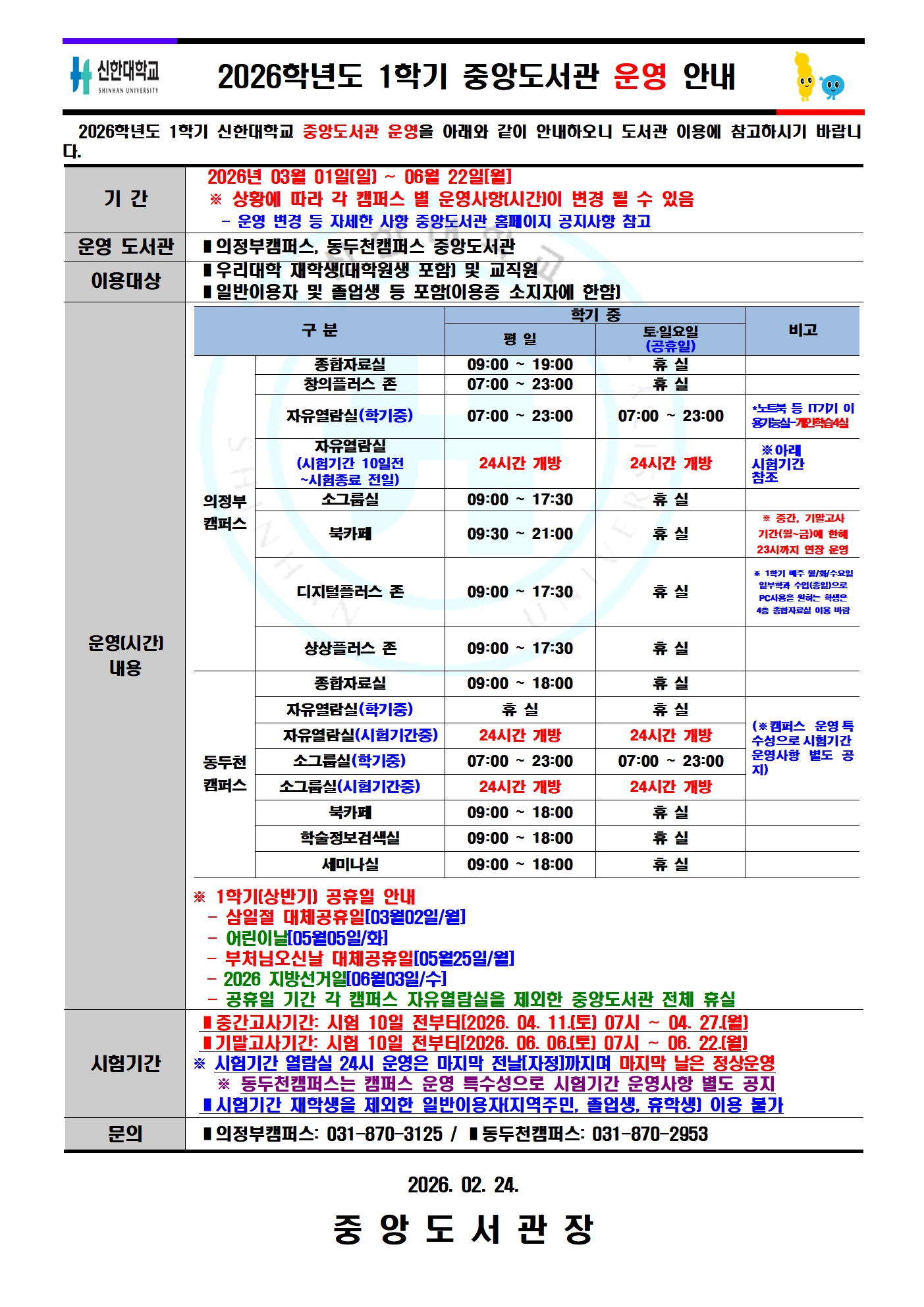 아래와 같이 2026학년도 중앙도서관 1학기 운영 안내를 하오니 이용에 참고 바랍니다.